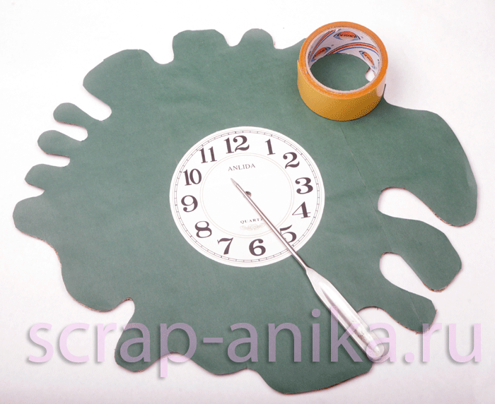 вырезаем по контуру наши будущие часы. Делаем по центру отверстие. ВНИМАНИЕ! Отцентрируйте часы! Я для этого вставила шило в отверстие и прислонила к стене основу. Если основа не переворачивается, то Вы сделали всё правильно. Очень часто делают эту ошибку - не центрируют часы. А потом они на стене начинают переворачиваться и падать. Приклеила на основу зелёную бумагу (двойным скотчем или клеем - кому как удобно). Циферблат я не делала - поставила тот, который был с готовых часов. Еще взяла с готовых часов механизм и стрелки.