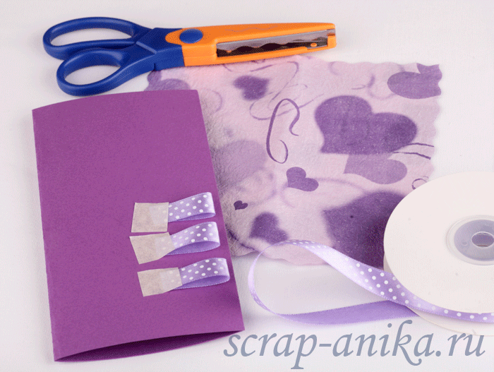 3. Картон свернула пополам (размер готовой открытки). На обложку я закрепила 3 кусочка ленточки строительным скотчем и фигурными ножницами вырезала квадрат из дизайнерской бумаги.