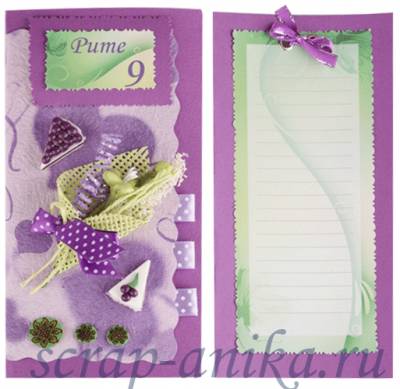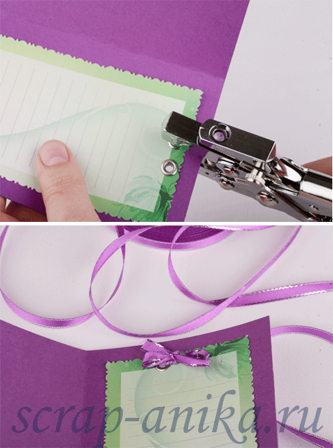 6. Делаем внутреннюю часть нашей открытки. Я подготовила листик с красивым фоном и линиями, на котором можно будет написать своё поздравление. Прикрепила я его блочками с помощью специальных щипцов для блочек и люверсов.. Я очень люблю использовать блочки в своих работах - они несут не только практическую функцию соединения, но и декоративную - можно завязать такой вот бантик, например. И страничка сразу становится веселее.
