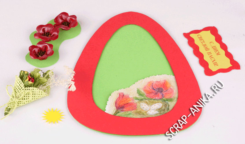 Обратите внимание - по внешнему контуру вырезается подложка открытки. Отдельно из другого картона вырезается вторая деталь - которая будет накладываться выше. И вырезается островок, на который мы потом наклеим декоративные цветы. Не обязательно использовать те же элементы, что и я - на то оно и творчество - используйте всё, что у Вас есть под рукой.