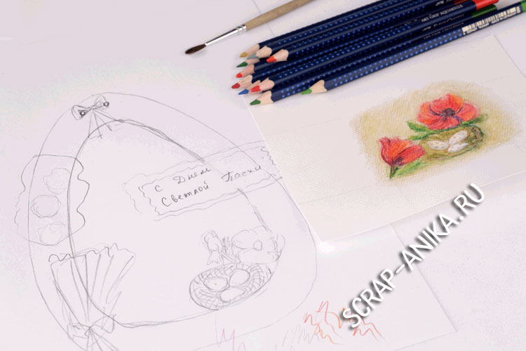 Я сделала эскиз открытки и акварельными карандашами нарисовала небольшие фрагменты. Если не умеете рисовать, возьмите готовый фрагменты из дизайнерской бумаги.