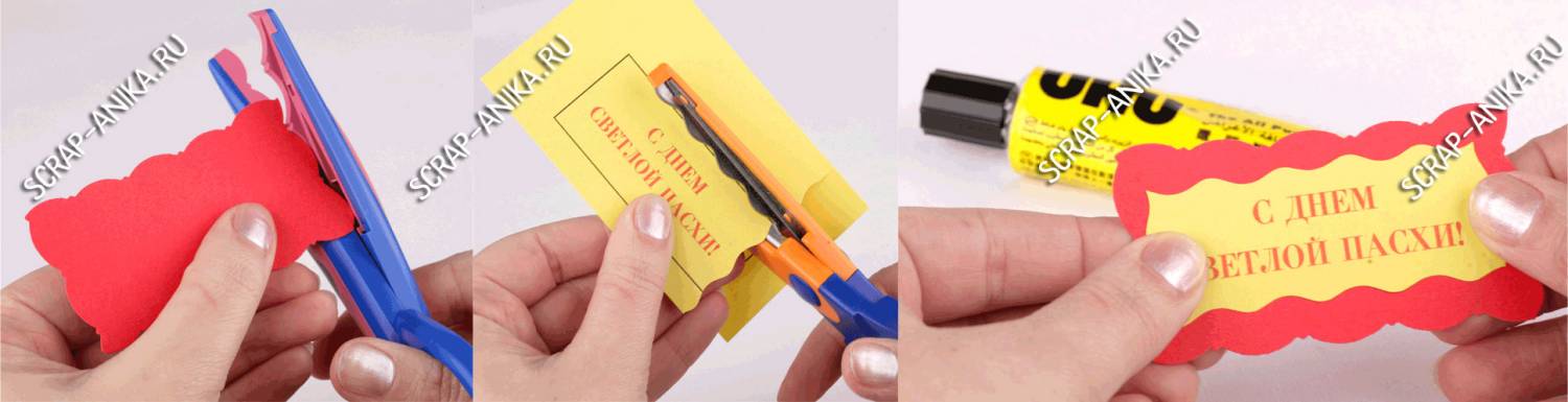 На принтере распечатала надпись "Светлой Пасхи", вырезала декоративными ножницами саму надпись и подложку для неё. Склеила их между собой. Все картинки масштабируются (для увеличения нажмите на картинку).