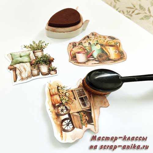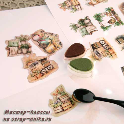 Вырезаю рисунки по контуру. Края тонирую штемпельными чернилами.