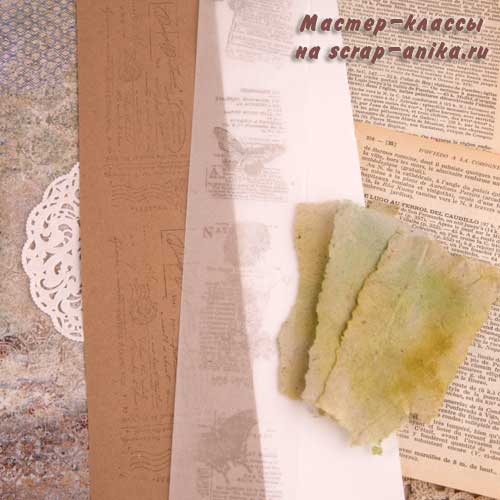 Во-вторых, подбираю бумагу разного стиля и цвета. Стараюсь брать бумагу тонкую. Если беру с фоновой расцветкой, то в той же цветовой палитре. Для этого проекта я взяла фоновую бумагу из коллекции ВИНТАЖНЫЙ КОВЕР, несколько листиков из старой книги, полупрозрачную бумагу ручной работы (я ее тонировала акварелью), крафт бумагу, кальку и ажурную салфетку.