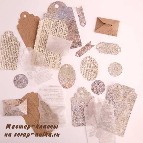 Из бумаги я делаю вырубку: тэги, фишки, рамки, ярлыки, конвертики и т.п. Я делаю их сразу много, так как эти детали нейтральные и их можно будет использовать в других работах.