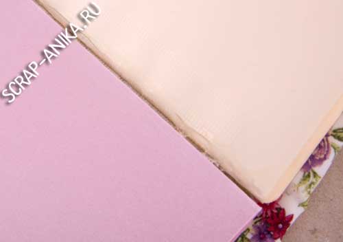 7. Делаем форзацы. Сворачиваем розовый картон пополам. Вырезаем по размеру блока. У вас должен получиться согнутый пополам лист размером 290х200 мм. Если Вы их декорируете, в самый раз это сделать. Моя цель сейчас - просто показать, как крепится блок, поэтому я декорировать не буду. У готовых блоков аккуратно отодвинуть марлю к самому краю.