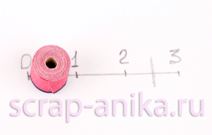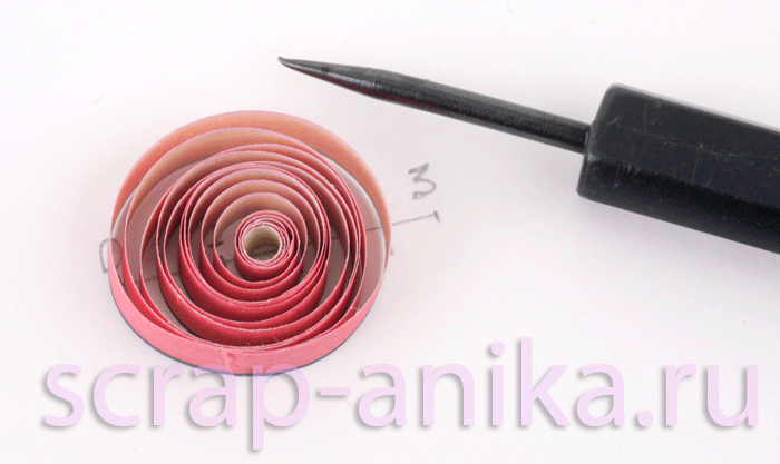 3. Теперь ролик нужно ослабить. Я Отмерила 2,5 см - это и будет длина моих лепестков. Тем же шилом равномерно распределяю ролик. Так как лепесток - отдельная деталь, я сразу приклеила конец бумаги и он уже не увеличится в размере.