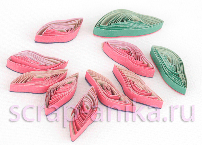 5. Из зелёной бумаги формирую два зелёных лепестка. Вот такие лепестки у меня получились. Они могут быть разными по длине и толщине.
