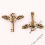 Подвеска Ключик-сердечко с крыльями, односторонняя, литье, цвет бронза, р-р 13х29.5х2мм, отв-е 1мм, цена за 2 шт.