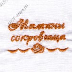 Мотив №2-12. Надпись "Мамины сокровища". Общая площадь вышивки 40х25 мм. Ткань - белый хлопок, с припусками по краям.. Цвет нитей выбираете самостоятельно. Если цвет не выбран, вышивка будет выполнена нитями цвета "охра".